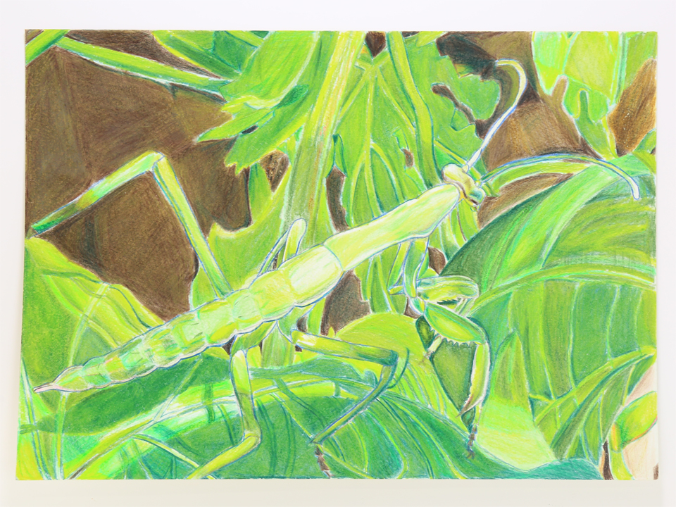 この描写びょうしゃ仕方しかたは、文句もんくのつけようがありません。全体のフォルムのとらえ方と構図こうずがすばらしいと思います。植物の少し元気のないところもよく表現ひょうげんされています。色えんぴつの使い方も上手ですね。とてもレベルが高いのでびっくりしました。